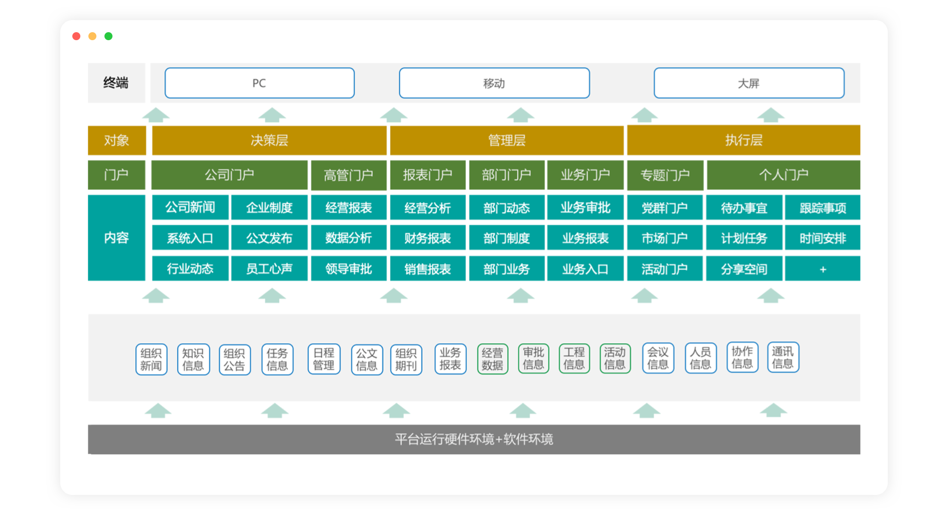 統(tǒng)一化:匯總分散的信息系統(tǒng),提供統(tǒng)一的登錄與工作界面,統(tǒng)一消息、待辦、發(fā)布與處理。 個性化:面向管理權限、用戶角色、使用場景,提供個性化的內(nèi)容構成、信息布局與呈現(xiàn)。 集成化:把各種業(yè)務應用資源、數(shù)據(jù)資源、信息資源統(tǒng)一集成,實現(xiàn)集中訪問和信息呈現(xiàn)。 智能化:門戶與場景相結合,自動推送相關信息,讓信息和事務主動找人,企業(yè)運營高效化。 安全化:嚴密的權限體系,對門戶主題、菜單、數(shù)據(jù)訪問進行控制。支持分級分權權限管理。
