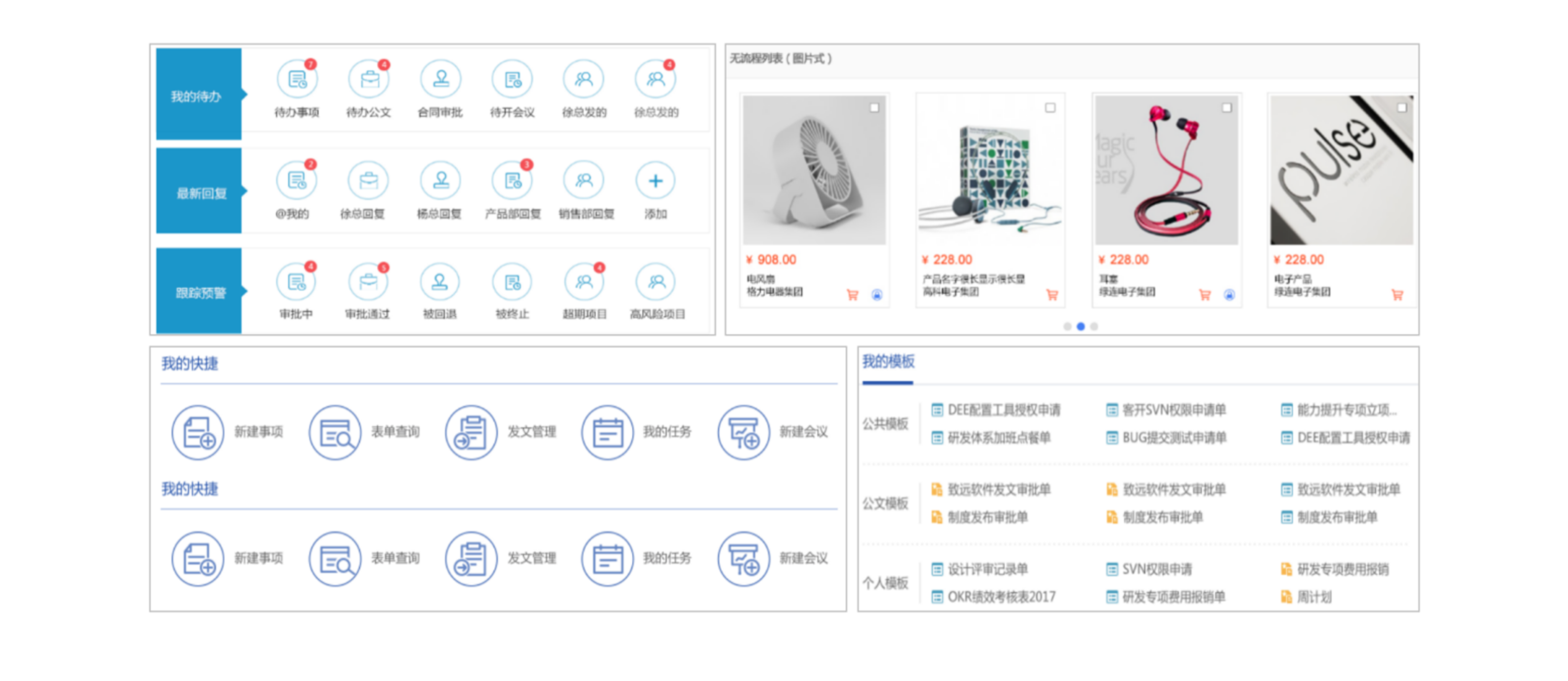 可以按場景/應用/職能/角色/專題等多種方式,構建不同風格、不同內(nèi)容的獨立門戶, 分類清晰,按照待辦類、日程類、消息類、應用磁貼等分區(qū),便于信息查看