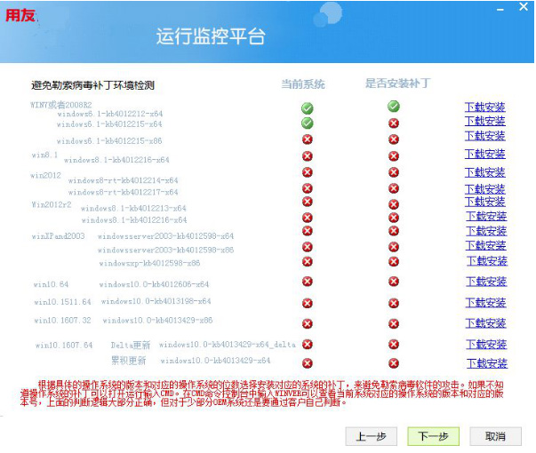 為了協(xié)助客戶預(yù)防和規(guī)避勒索病毒帶來的危害,U8產(chǎn)品研發(fā)部門快速開發(fā)了勒索病毒安全補(bǔ)丁檢查工具,通過工具,客戶可以了解自己服務(wù)器缺少哪些勒索病毒相關(guān)補(bǔ)丁,也可以在線下載安裝所需補(bǔ)丁,確保服務(wù)器安全。