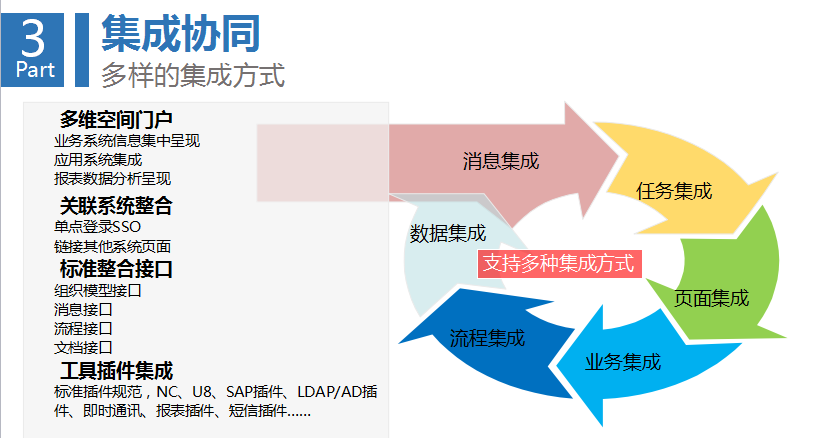 第三環(huán)是集成協(xié)同。任何企業(yè)都在多個(gè)系統(tǒng)中間,要思考多個(gè)系統(tǒng)之間怎么把數(shù)據(jù)共享起來(lái)?怎么把信息整合起來(lái)?怎么產(chǎn)生通用的信息門戶,能達(dá)到更高效的信息推送和自動(dòng)推薦?
